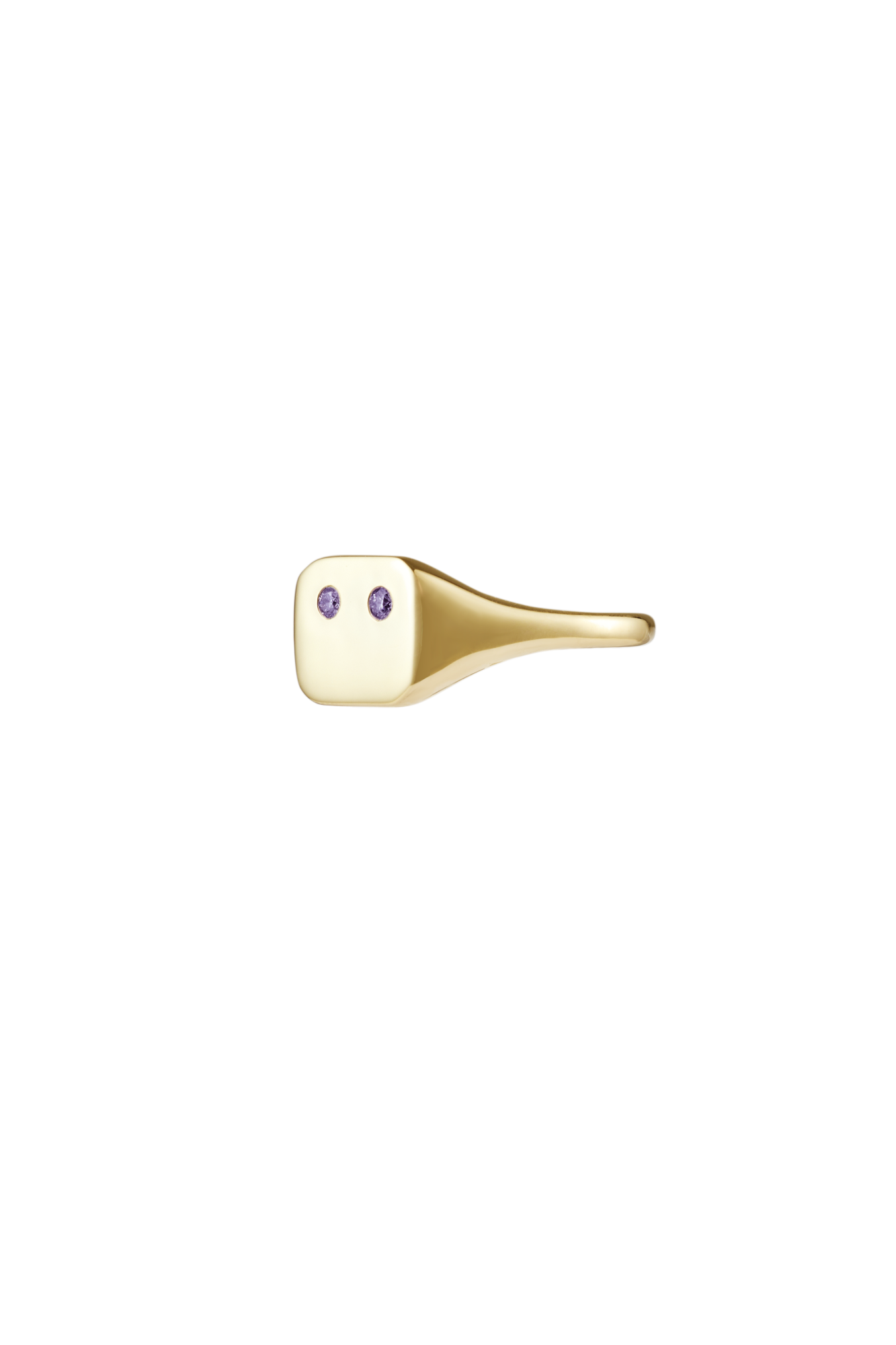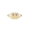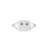 Beautiful everyday signet ring with beveled edges and face set with twin amethysts, resembling the “eyes” of a minimalist emoji. Purposefully left without a mouth, the face becomes a blank canvas, allowing the wearer to define their mood each day.