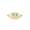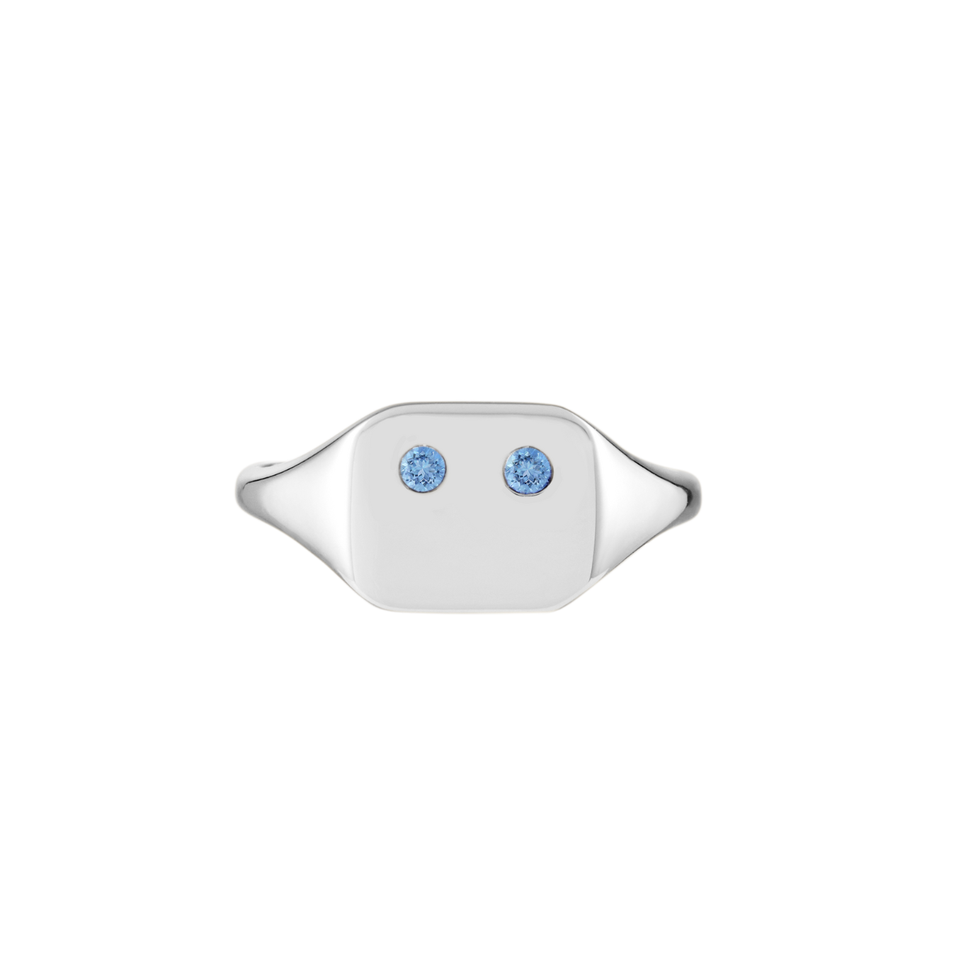 Beautiful everyday signet ring with beveled edges and face set with twin blue topaz, resembling the “eyes” of a minimalist emoji. Purposefully left without a mouth, the face becomes a blank canvas, allowing the wearer to define their mood each day.