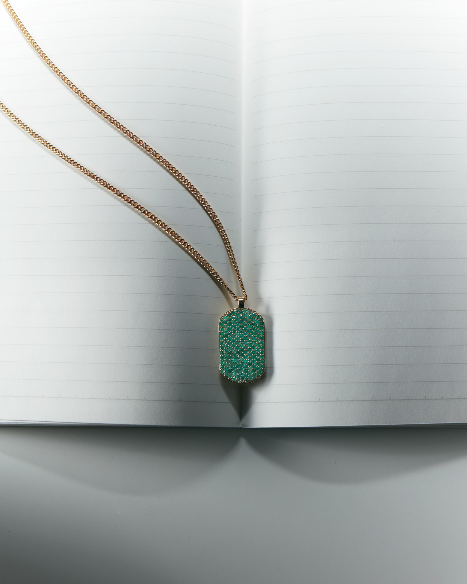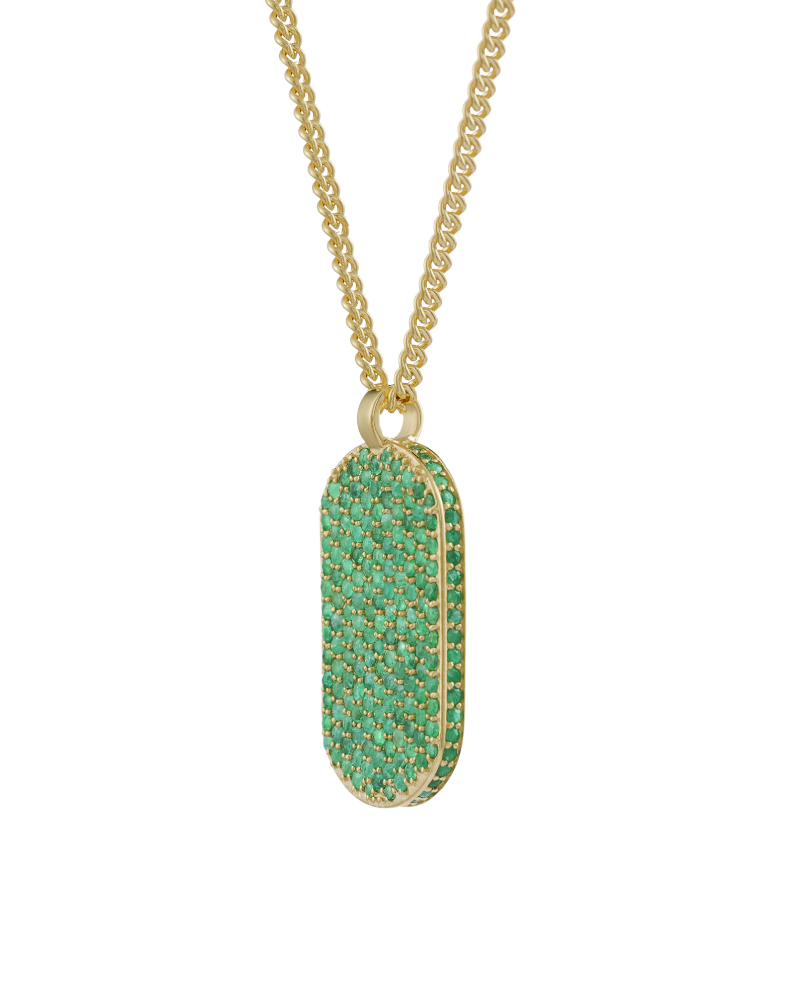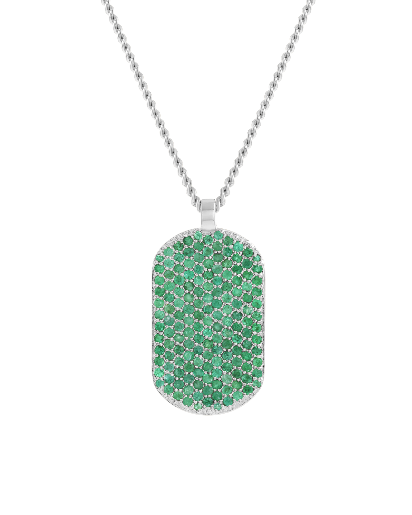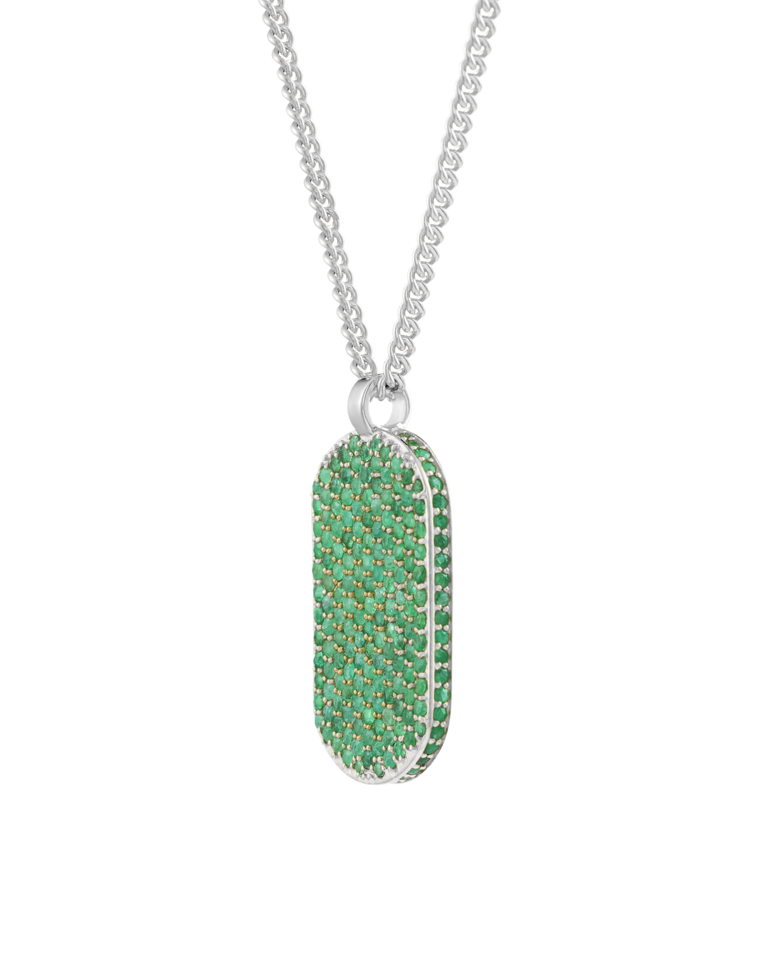Our signature ID pendant is set with emeralds on the front and around the pendant. Gemstones may vary in color.