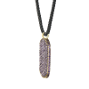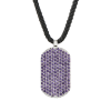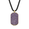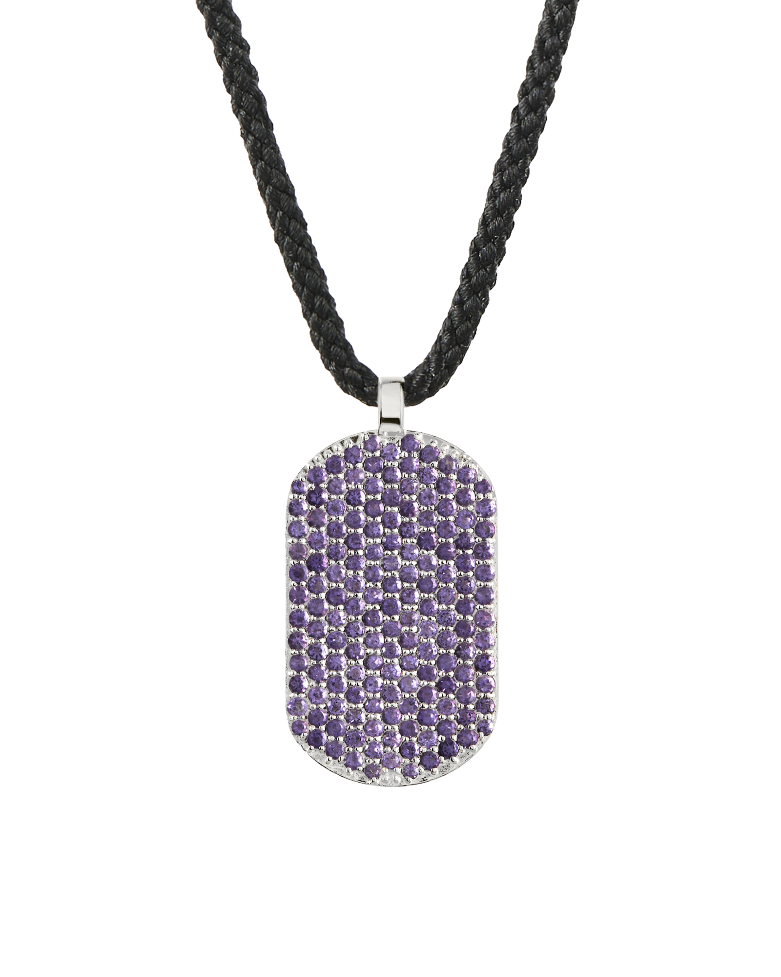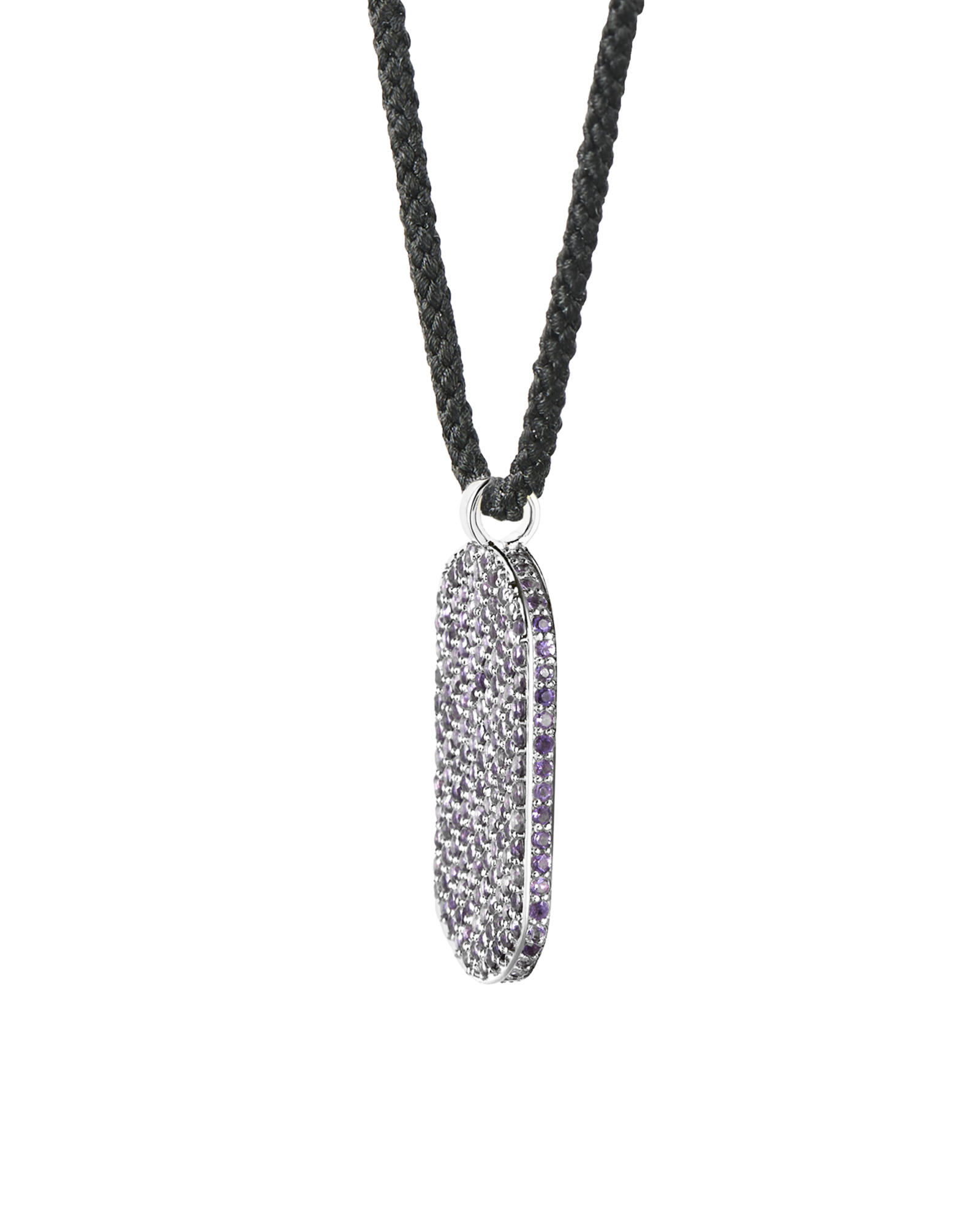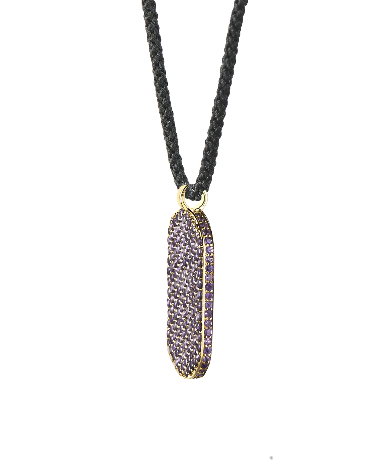 Our signature ID pendant is set with amethysts on the front and around the pendant. Paired with black Japanese silk cord to create this ultimate laidback luxurious necklace. Kindly note that necklace lengths can vary slightly. Gemstones may vary in color.