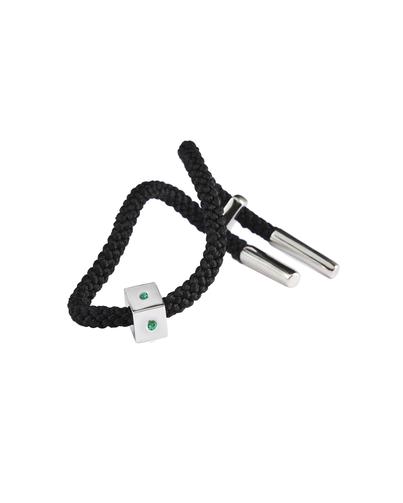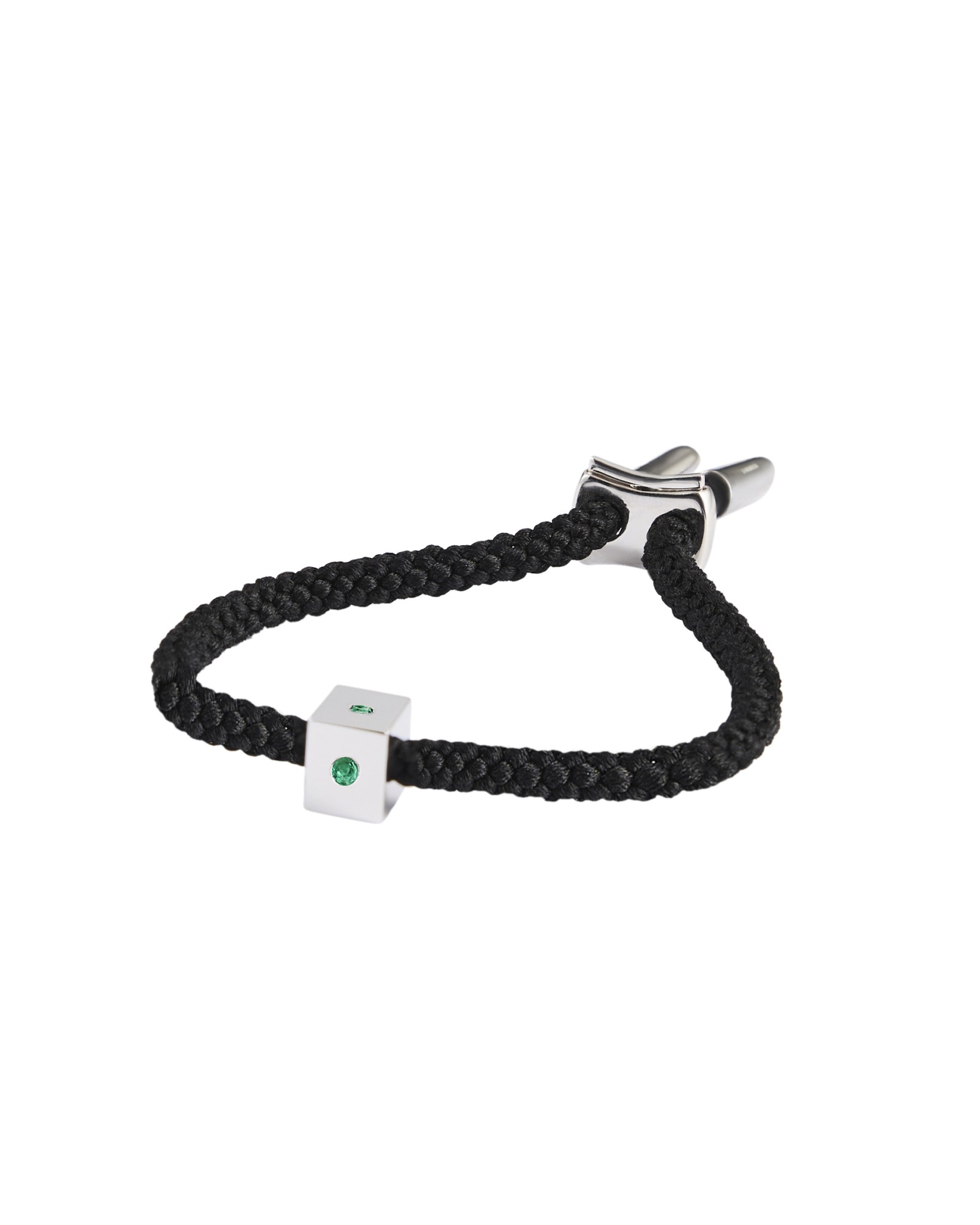 An elevated rework of the original Maii Cube Bracelet, this version is adorned with emerald on all four faces of the cube charm. The bracelet comes with a custom designed toggle clasp for an adjustable end. Length is measured without the end caps.