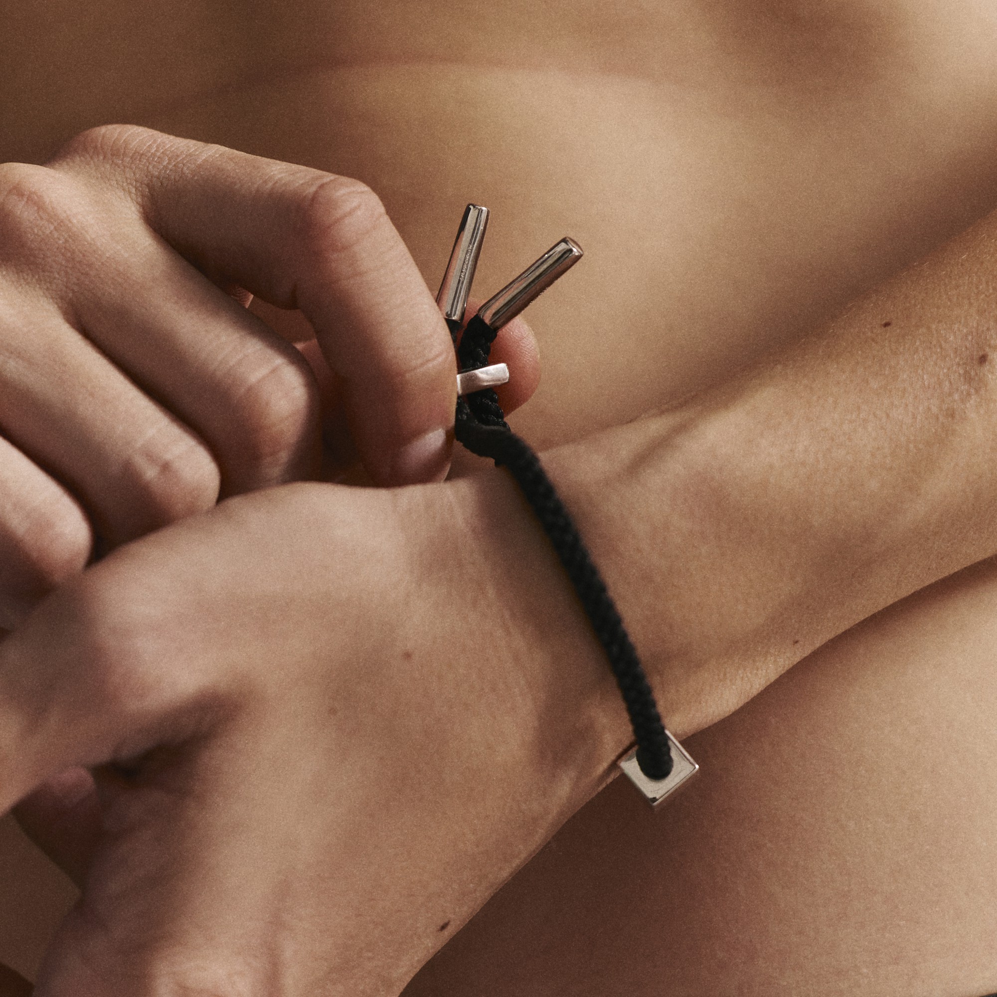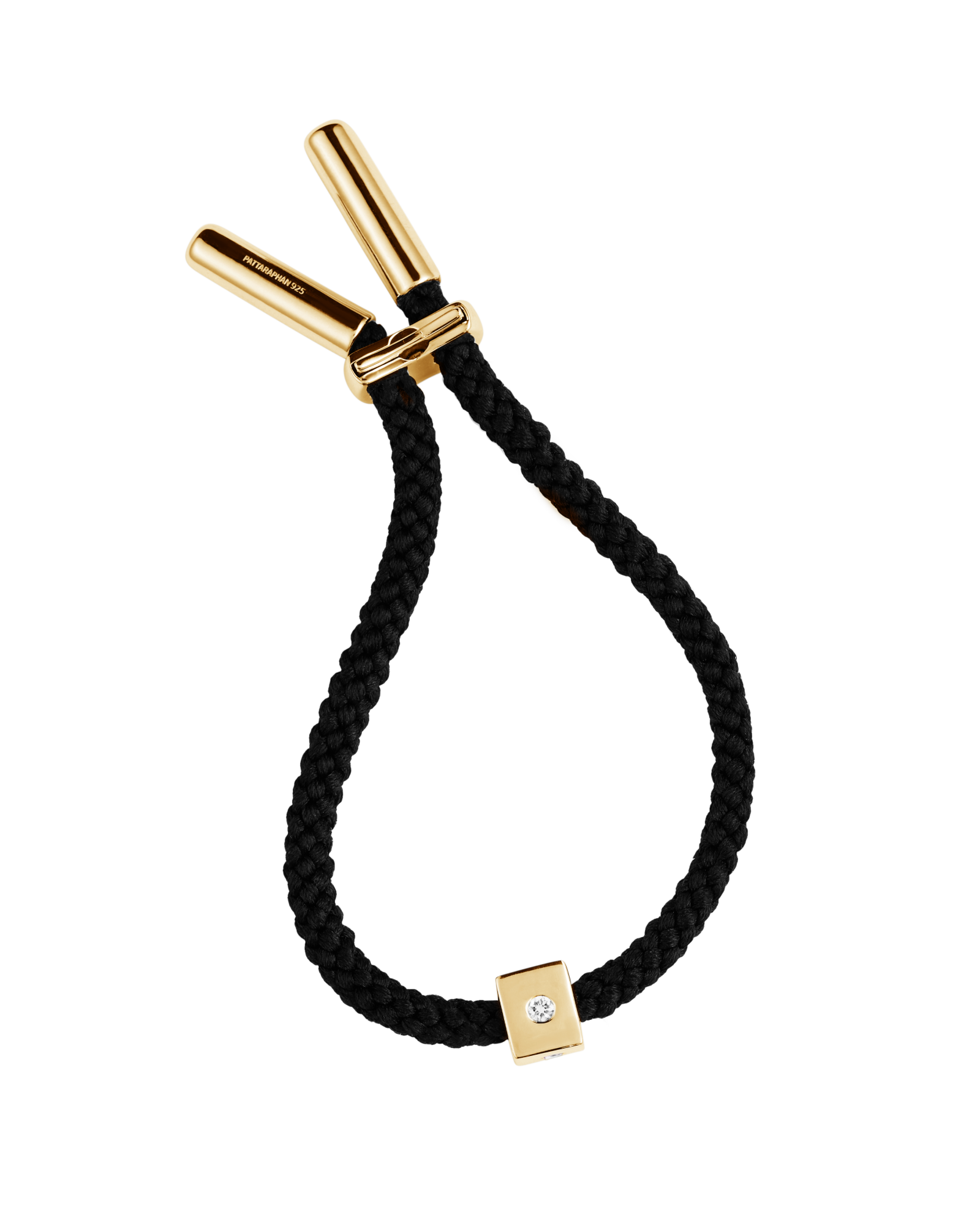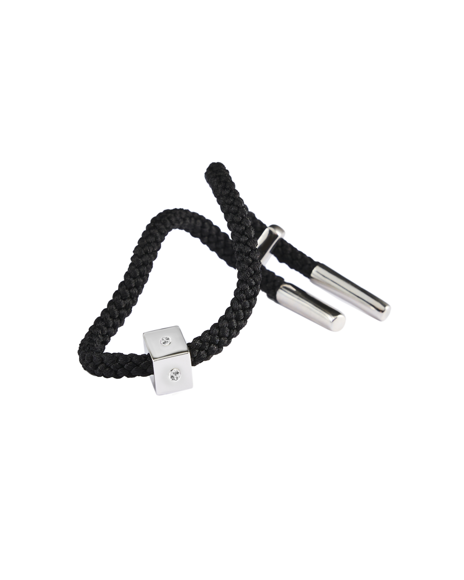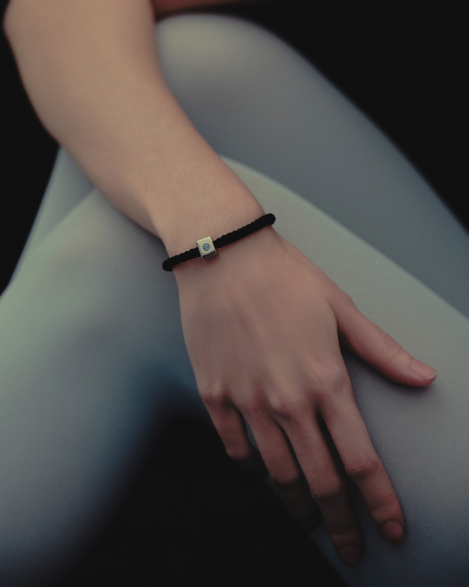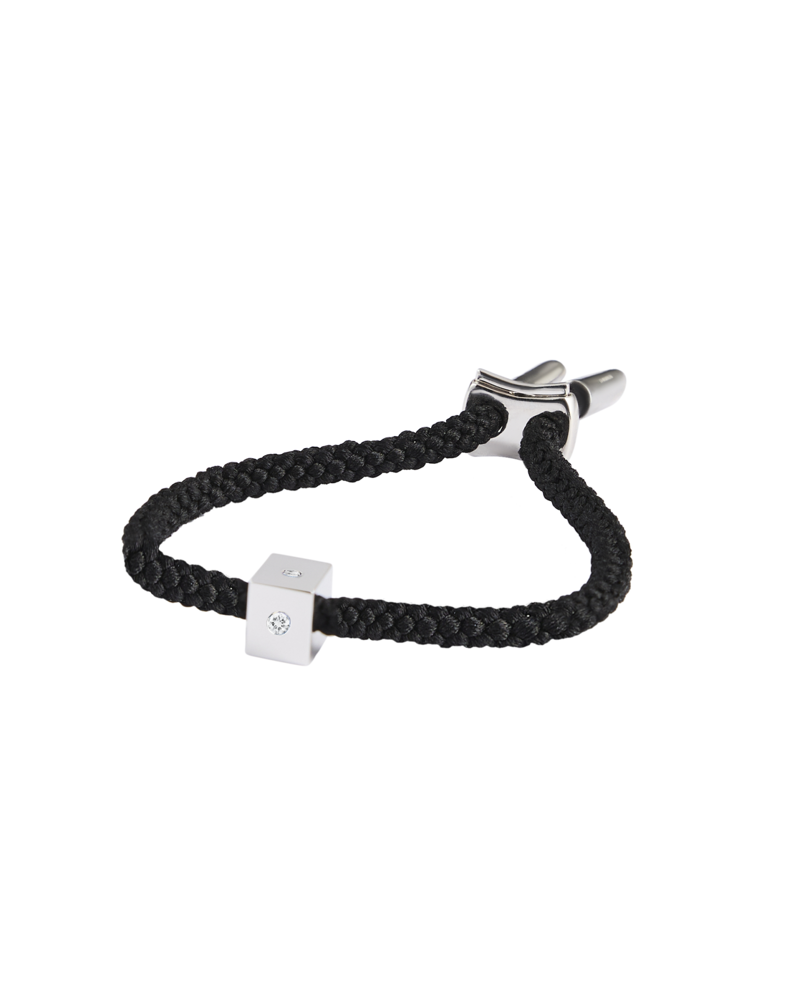 An elevated rework of the original Maii Cube Bracelet, this version is adorned with white sapphire on all four faces of the cube charm. The bracelet comes with a custom designed toggle clasp for an adjustable end. Length is measured without the end caps.