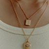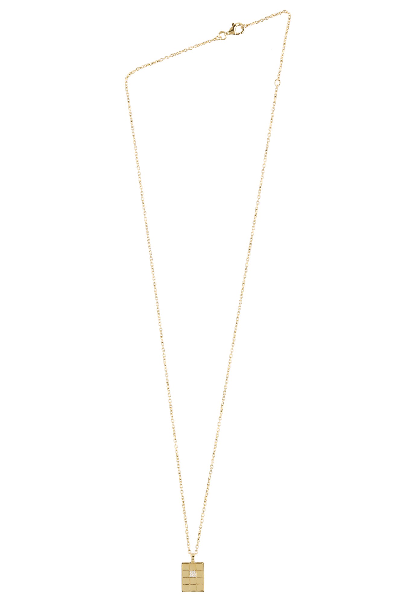 Our newest ID necklace style with a thin chain. The pendant features 9 diamonds set in the center.