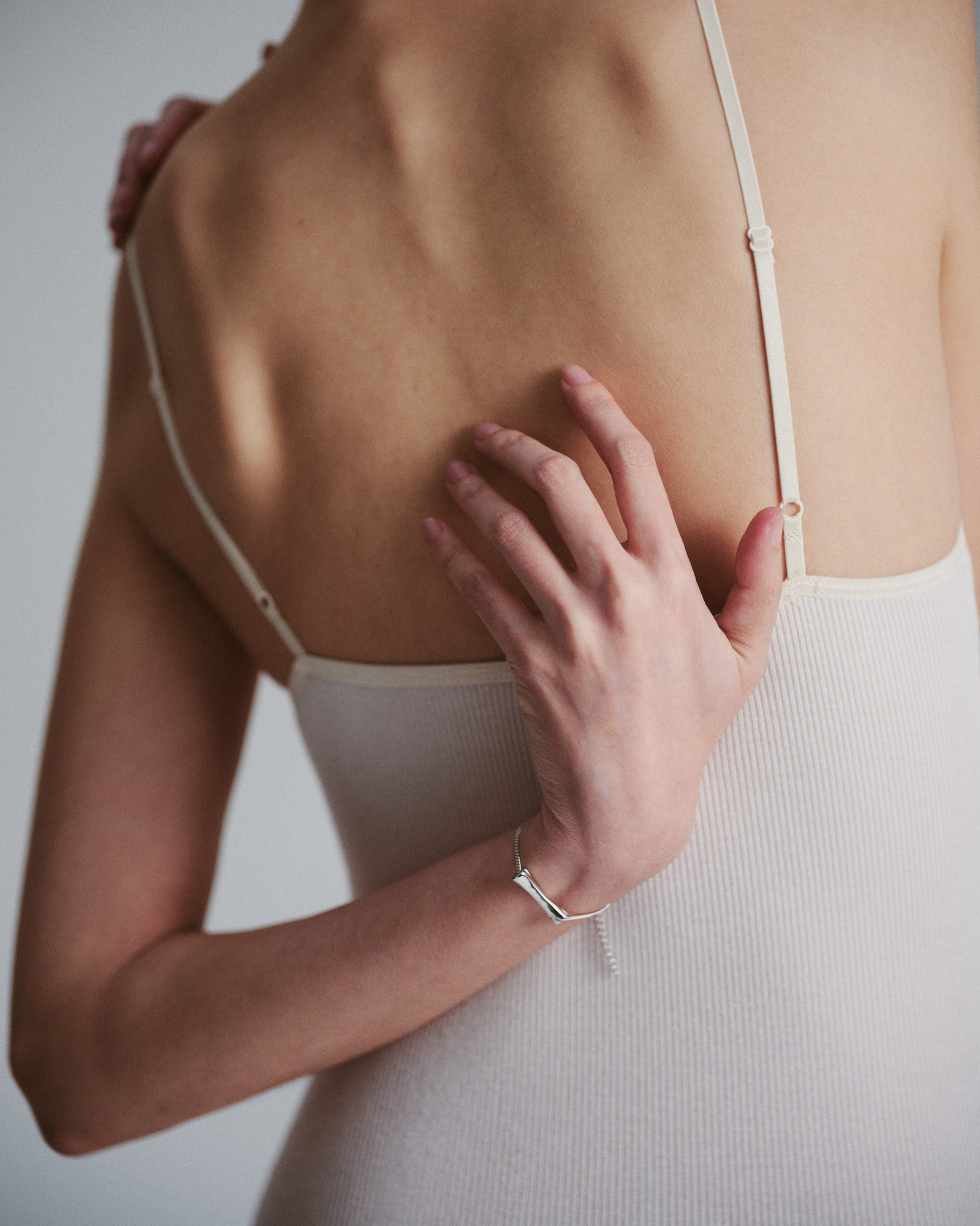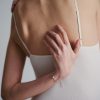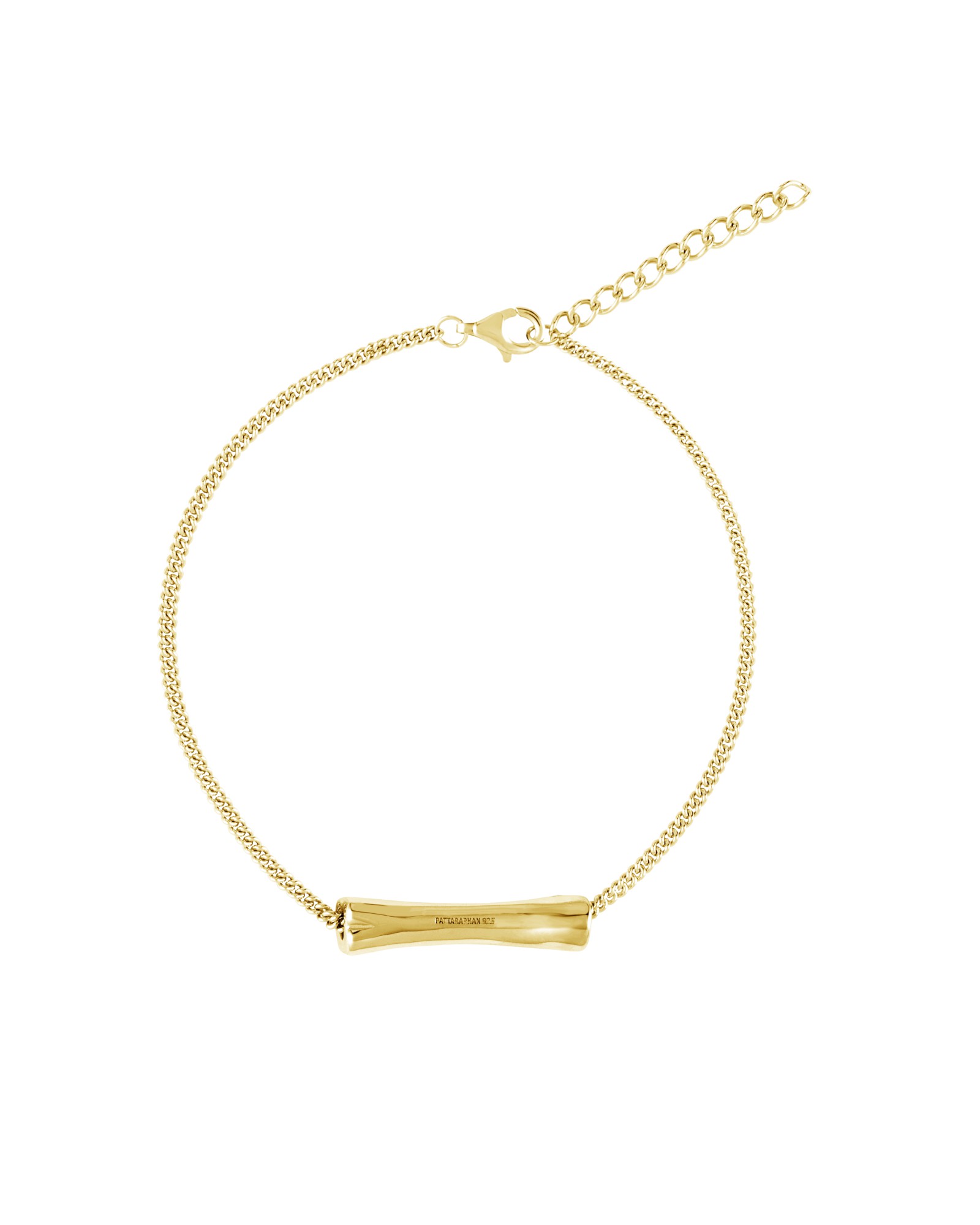 A single handcrafted bone-shaped pendant that is horizontally positioned and threaded through a fine curb chain, remaining free to swing gently with movement. Recommended to be worn tightly on the wrist.