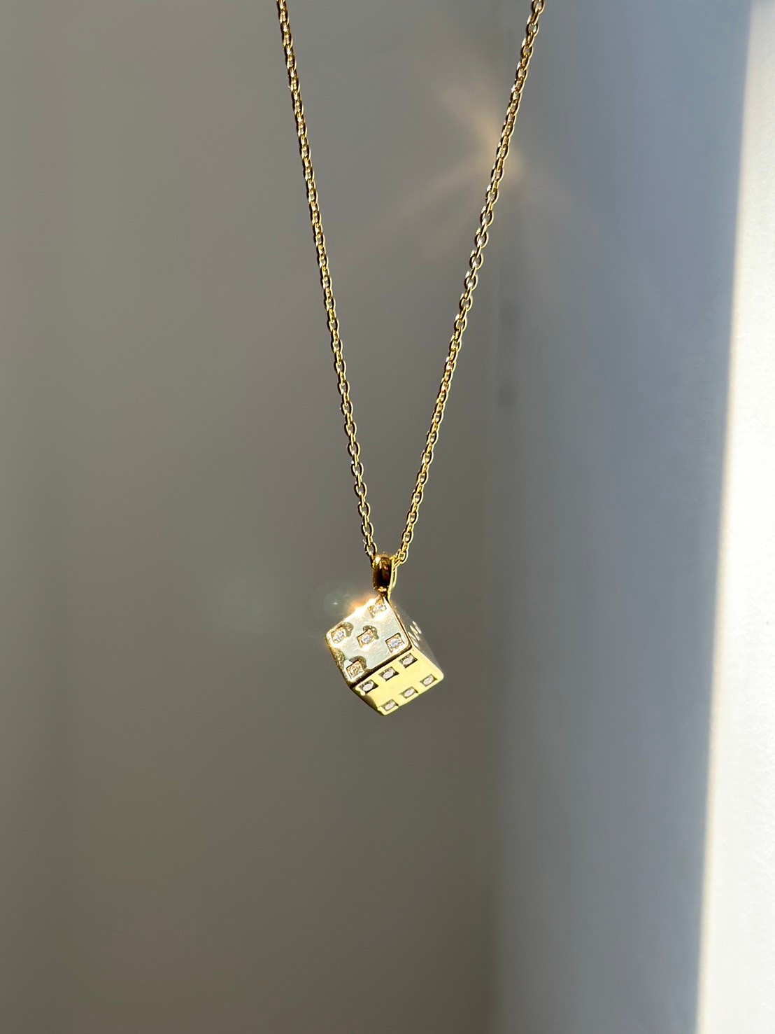 Solid dice pendant on a thin chain, featuring diamonds on all faces of the dice.