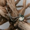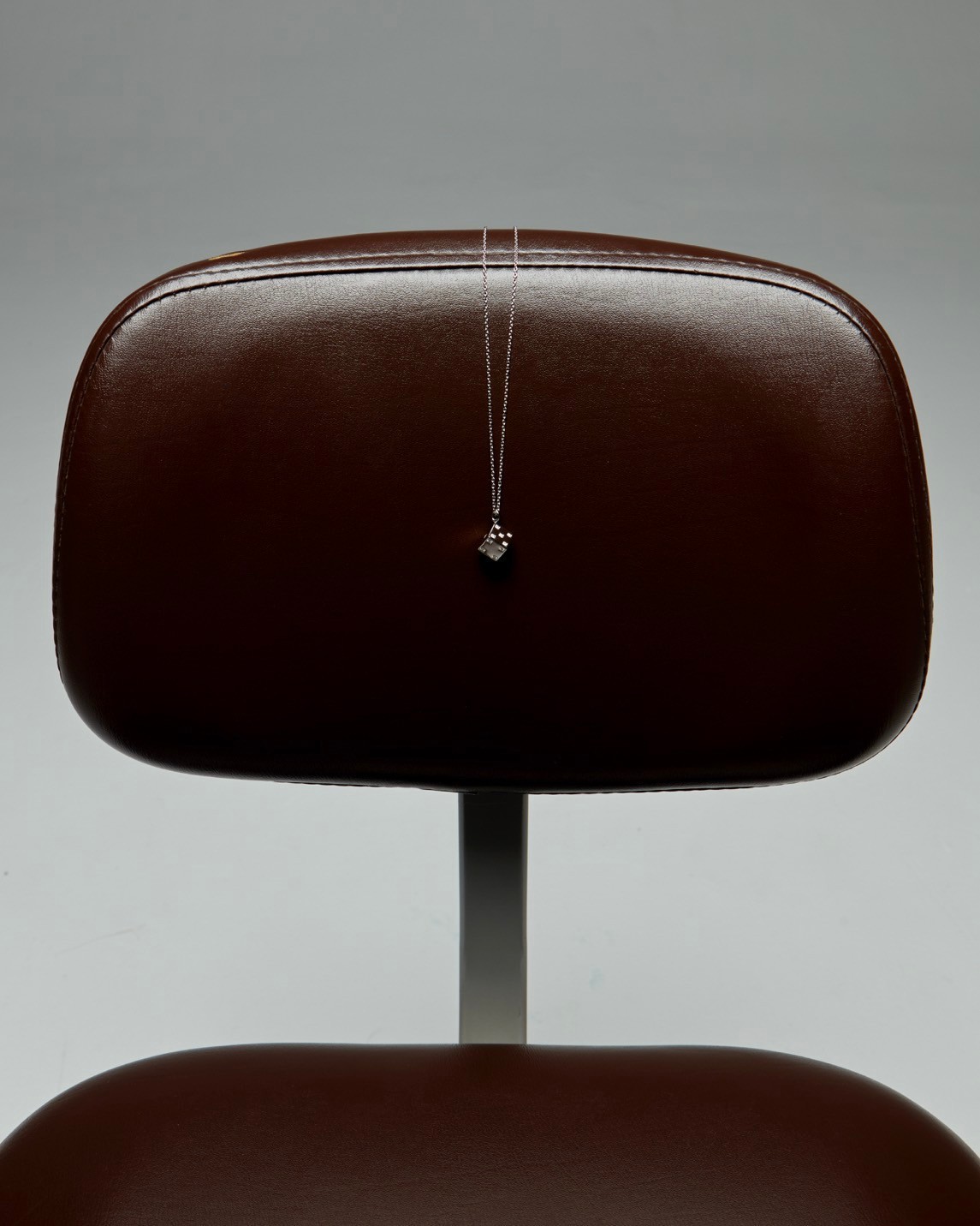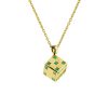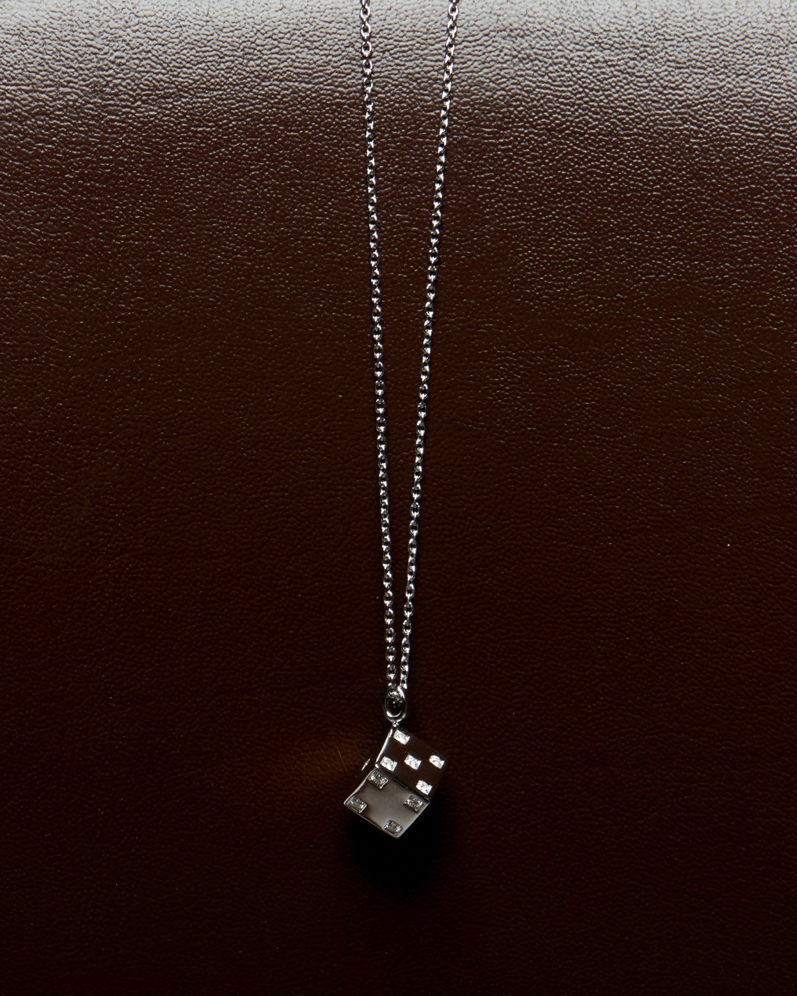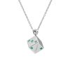 Solid dice pendant on a thin chain, featuring emeralds on all faces of the dice. Gemstones may vary in color.