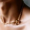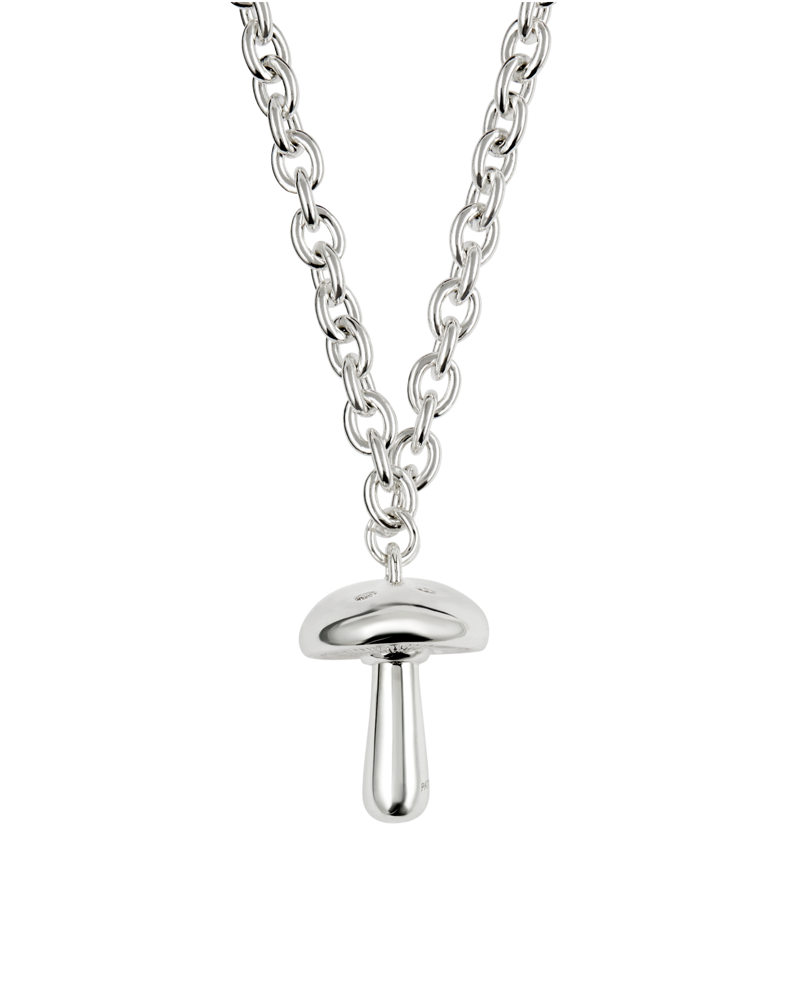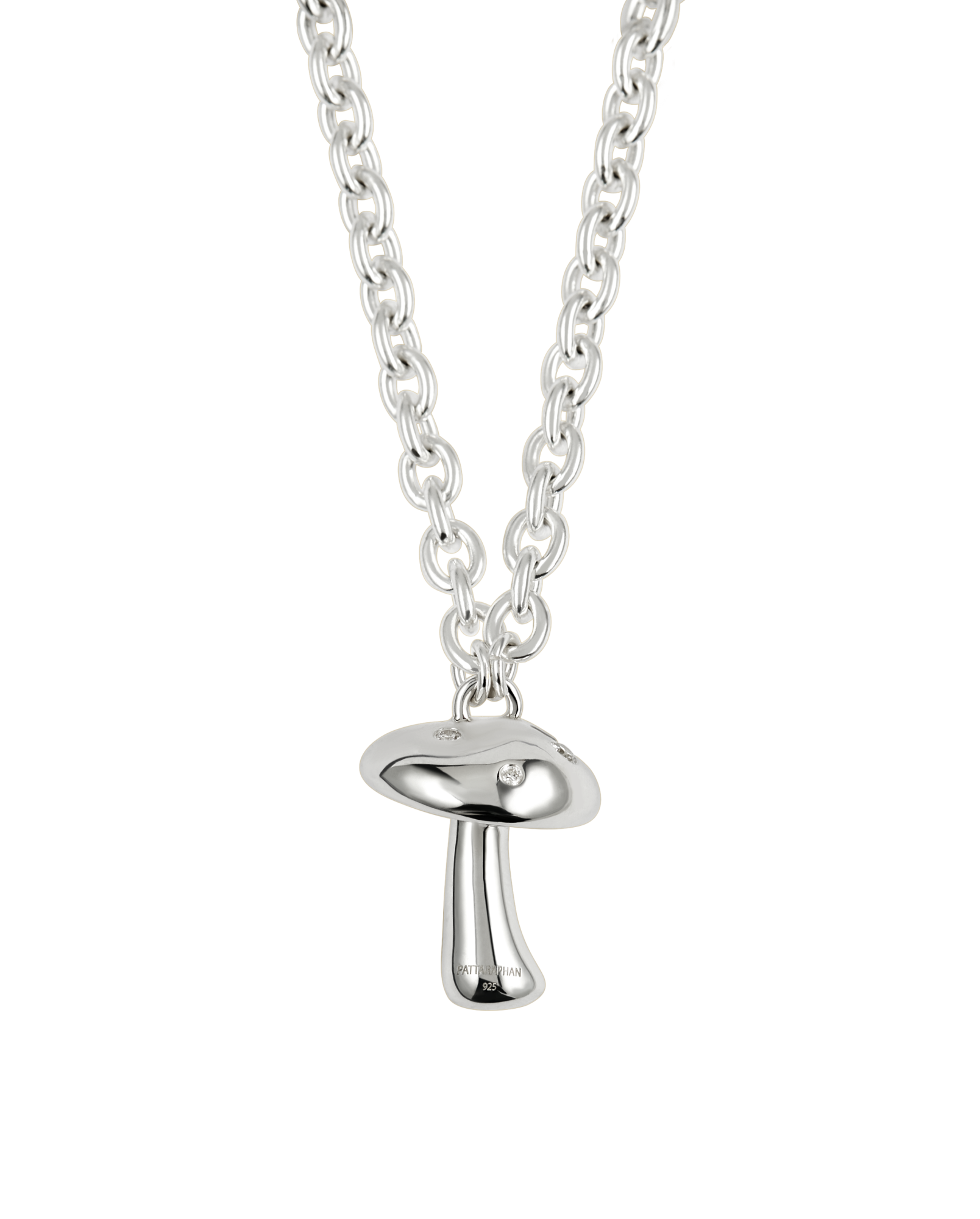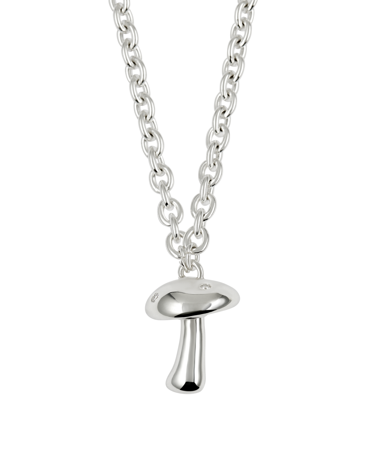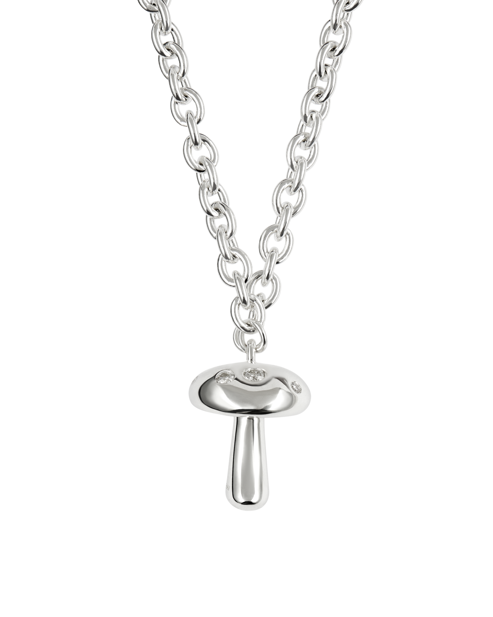 Chunky chain necklace featuring a chunky mushroom pendant with 6 diamonds set all around the top of the pendant.