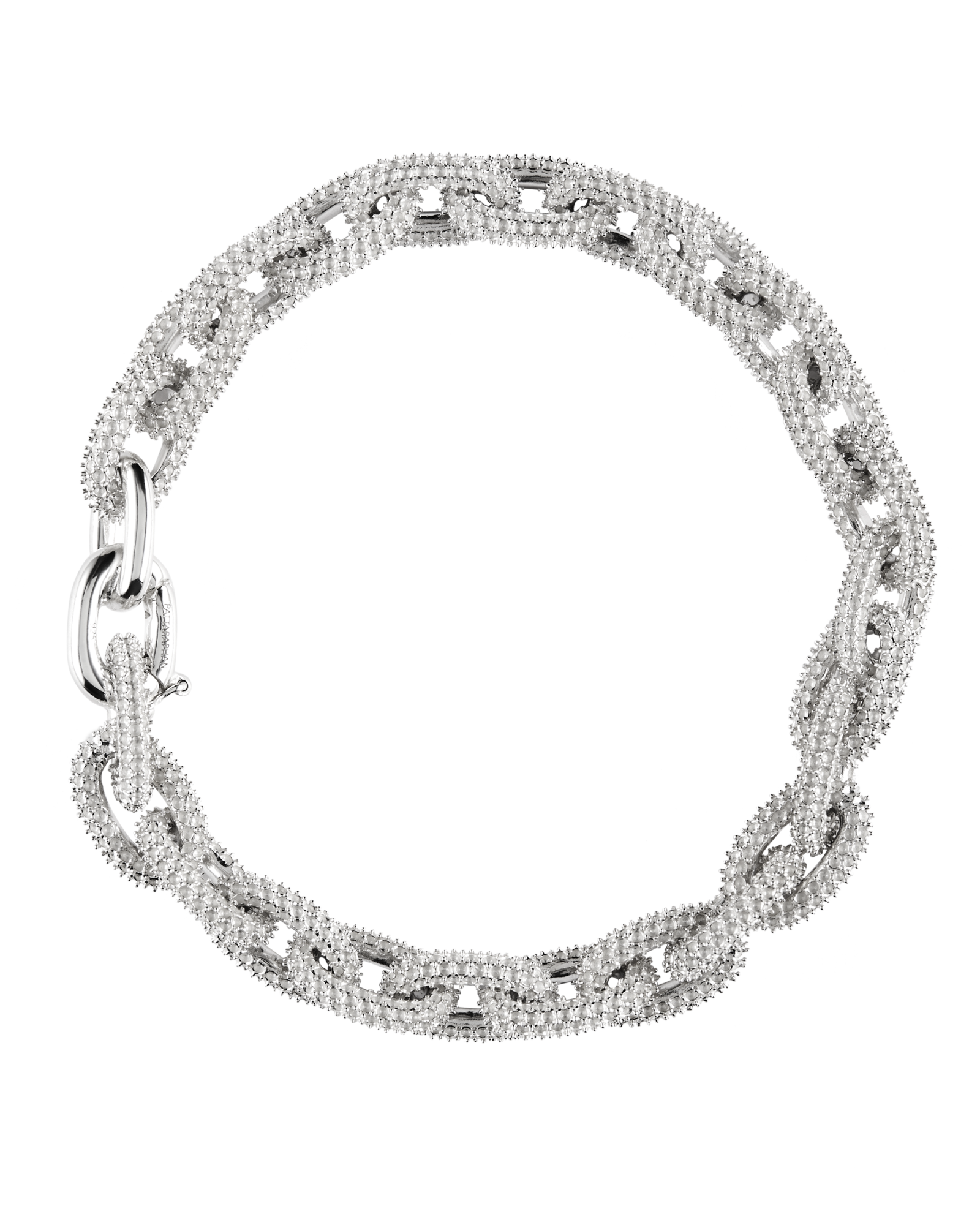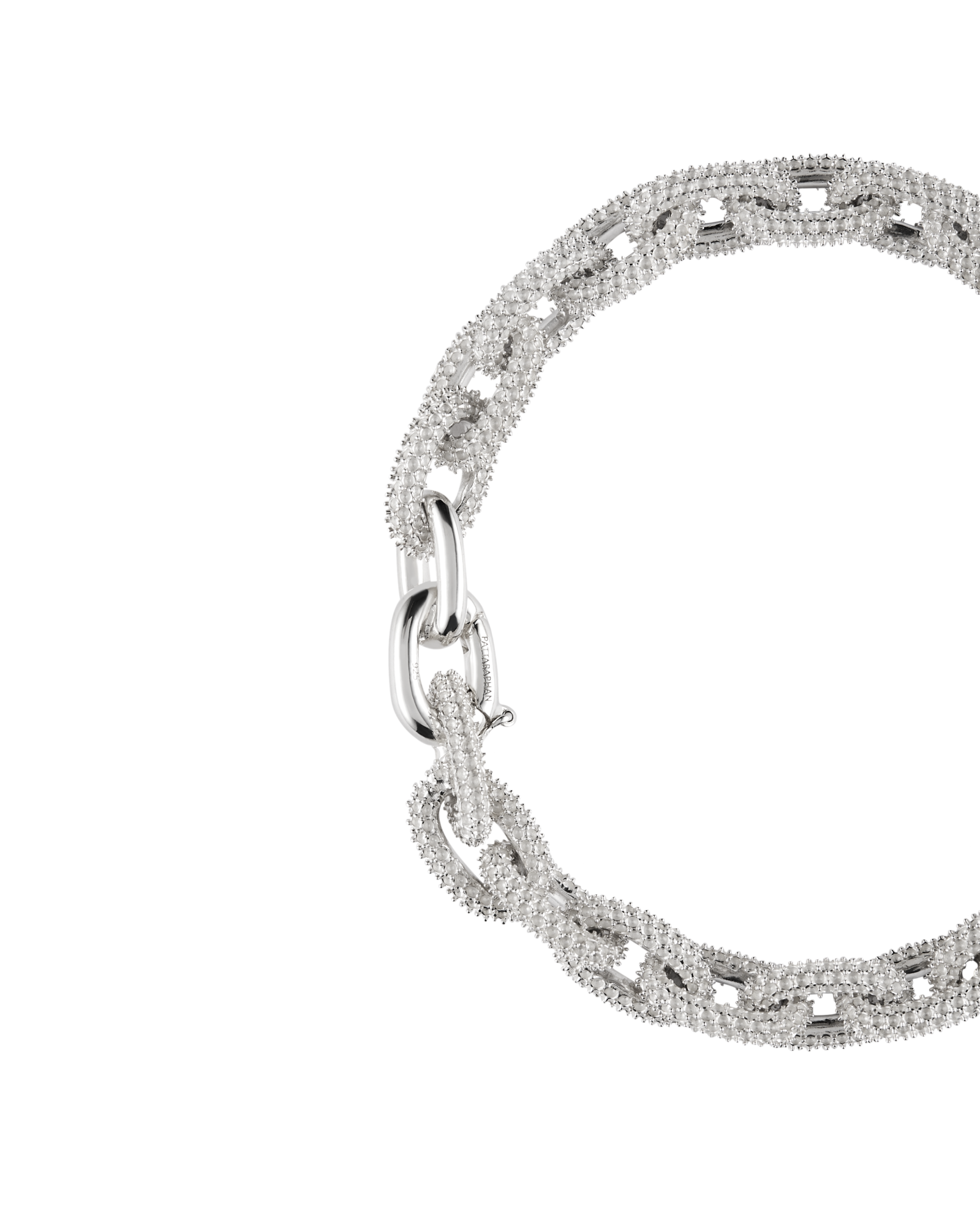 A bold chain bracelet features matte textured links oval links with a custom clasp. Due to the texture of the links, the bracelet can cause slight discomfort when worn.