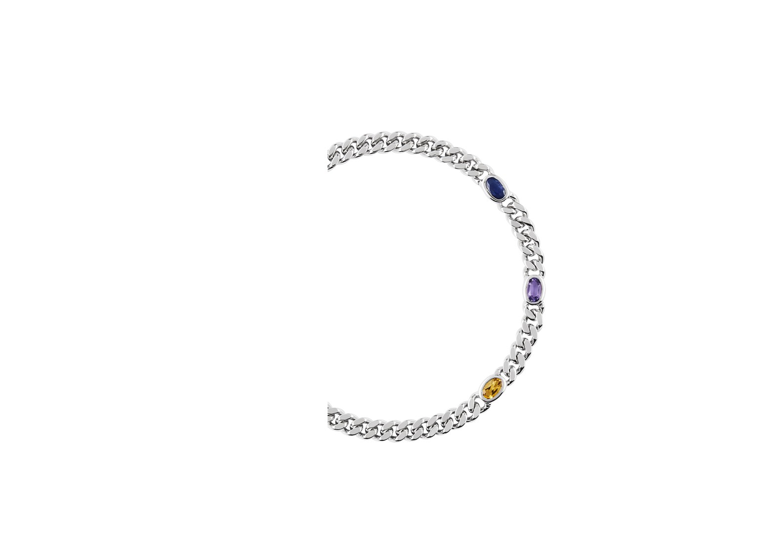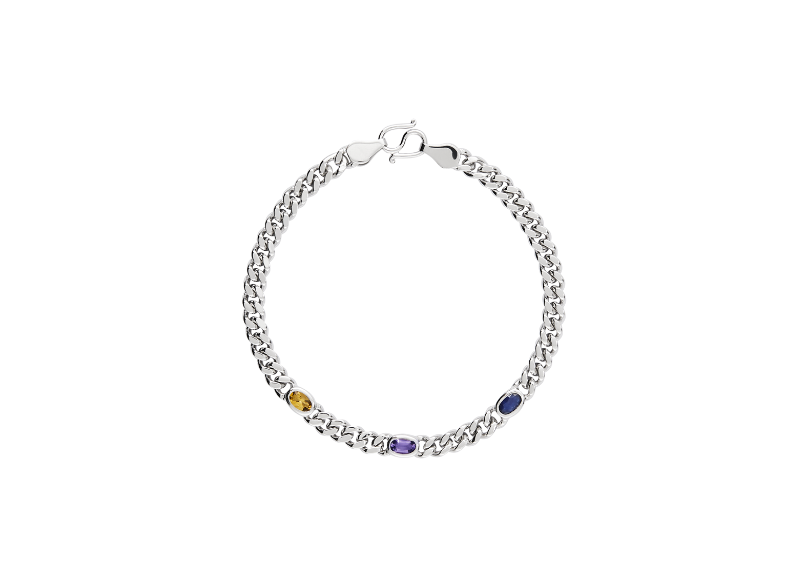Chain bracelet with a handmade S clasp. Featuring oval citrine, amethyst and blue sapphire. Gemstones may vary in color.
