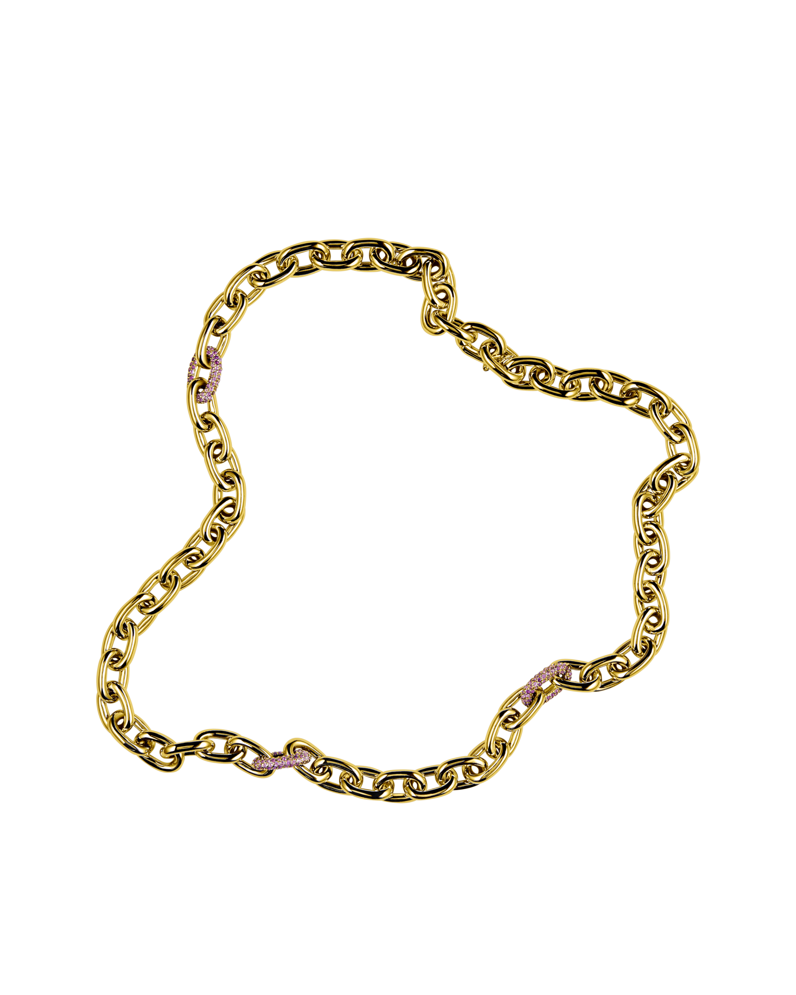 Chunky necklace with rounded links and a seamless custom clasp. Featuring three clasps with pavé amethyst. Gemstones may vary in color.