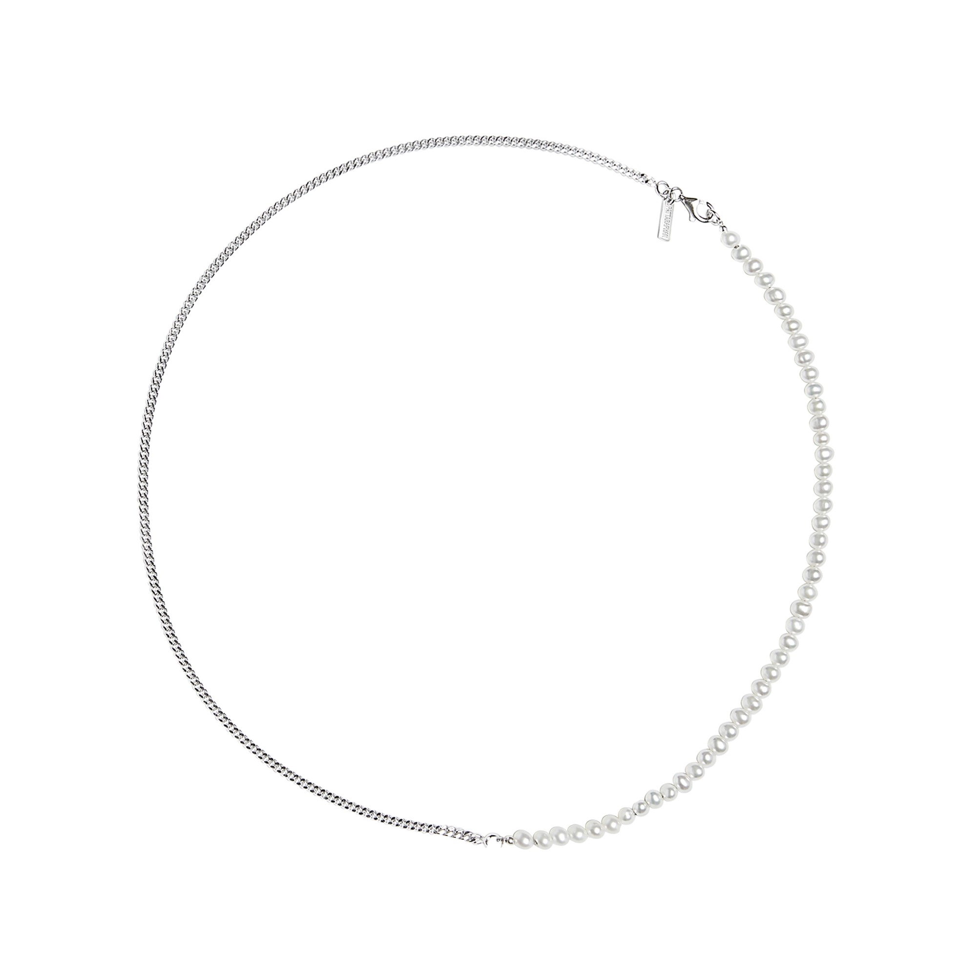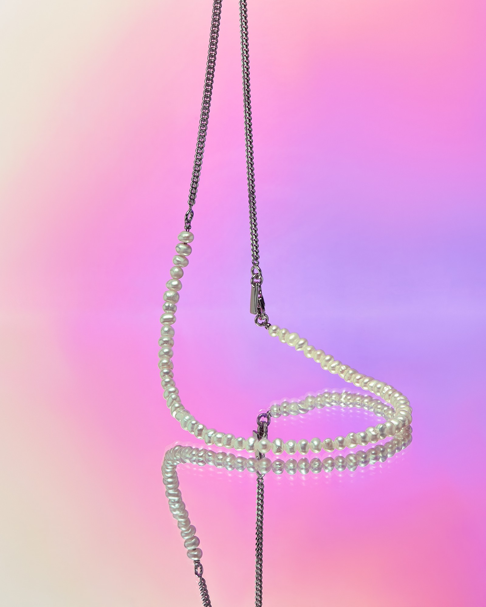 Materials: Rhodium plated sterling silver (silver) with 8″ of freshwater pearls
