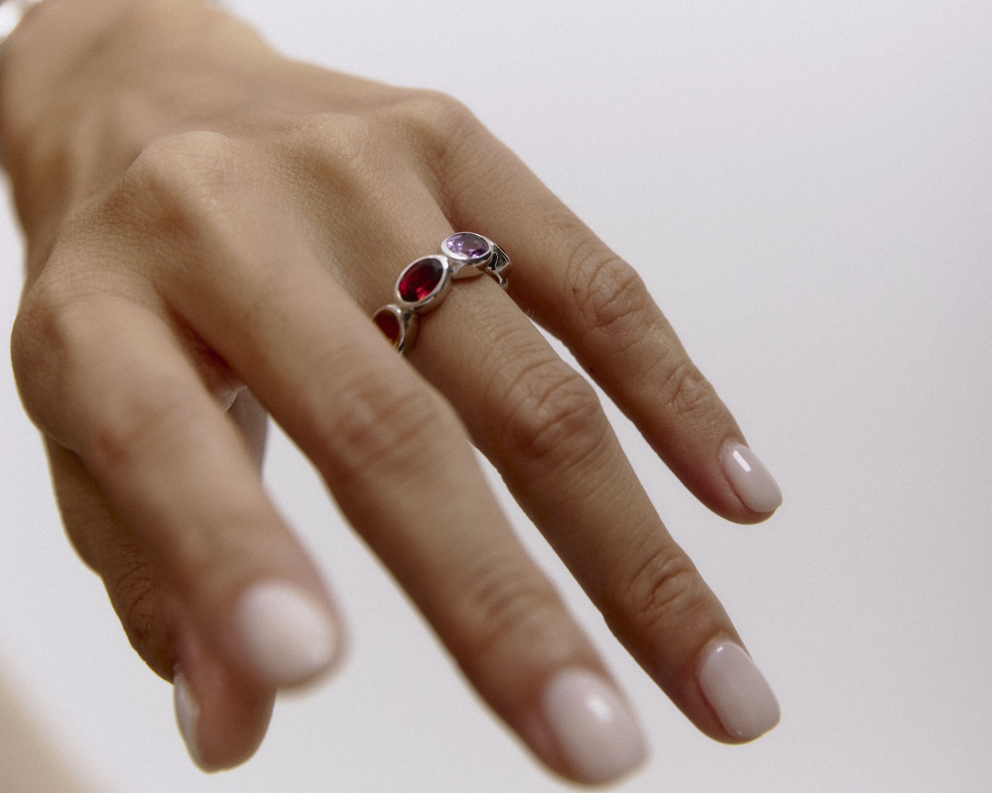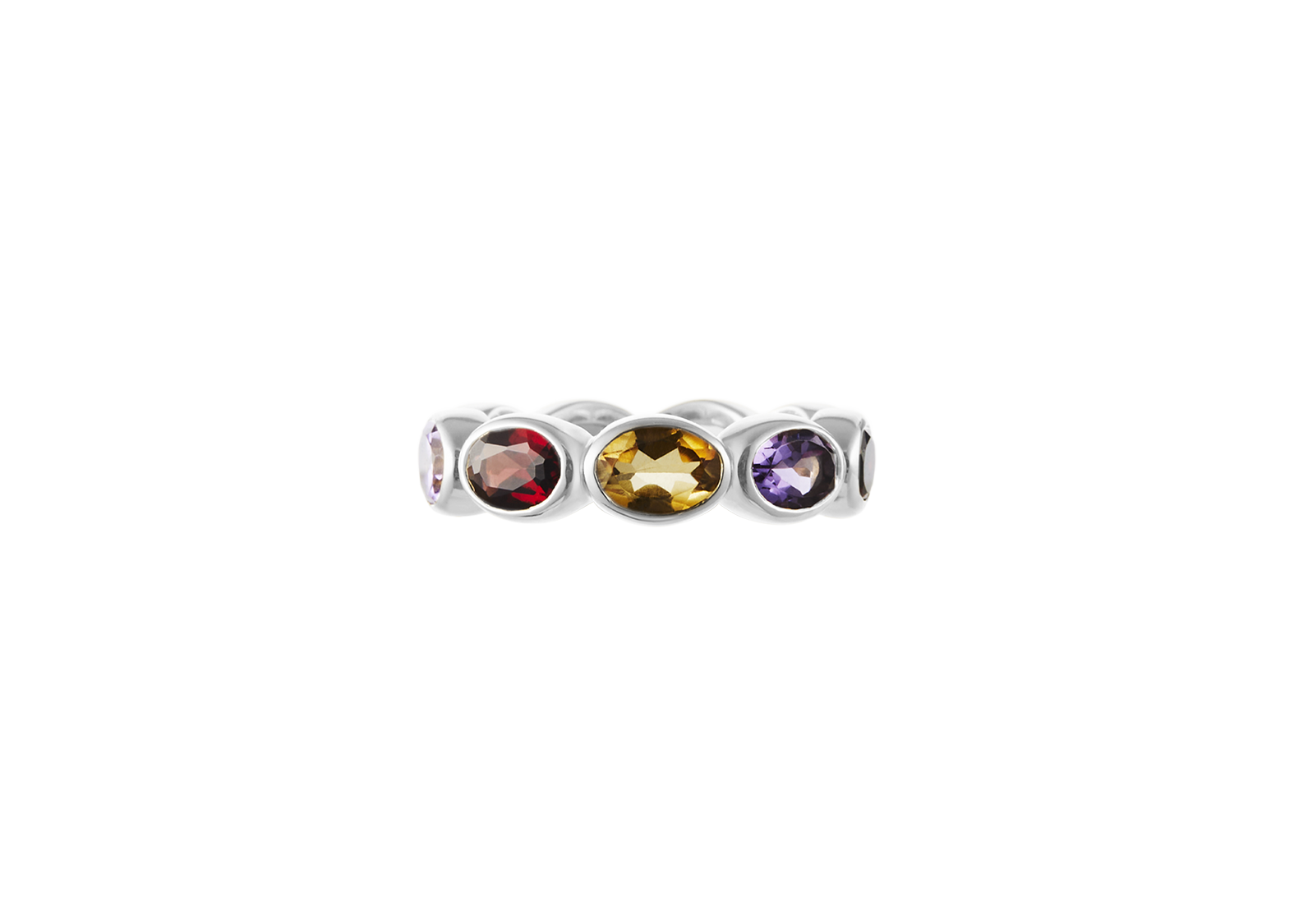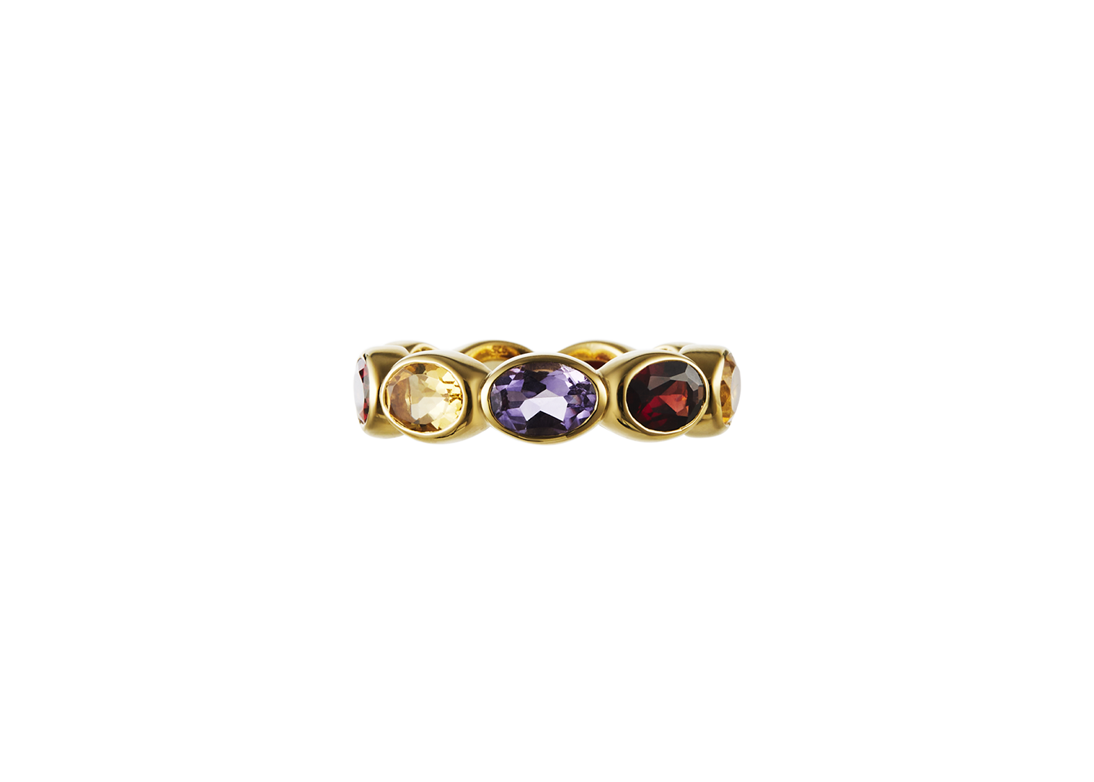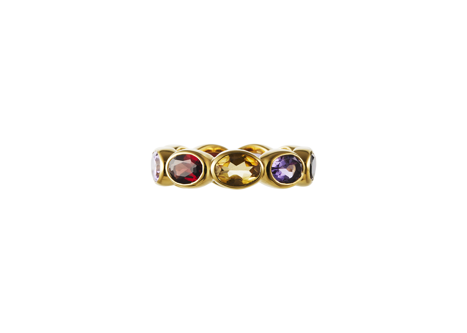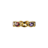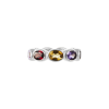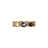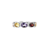 Our first signature band, Ying Band is a reiteration from our signature Ying Bracelet. The stones are set horizontally, mimicking the stones on the bracelet. Debuting with our “sunset” color way, the ring features a combination of red garnet, citrine and amethyst. Gemstones may vary in color.
