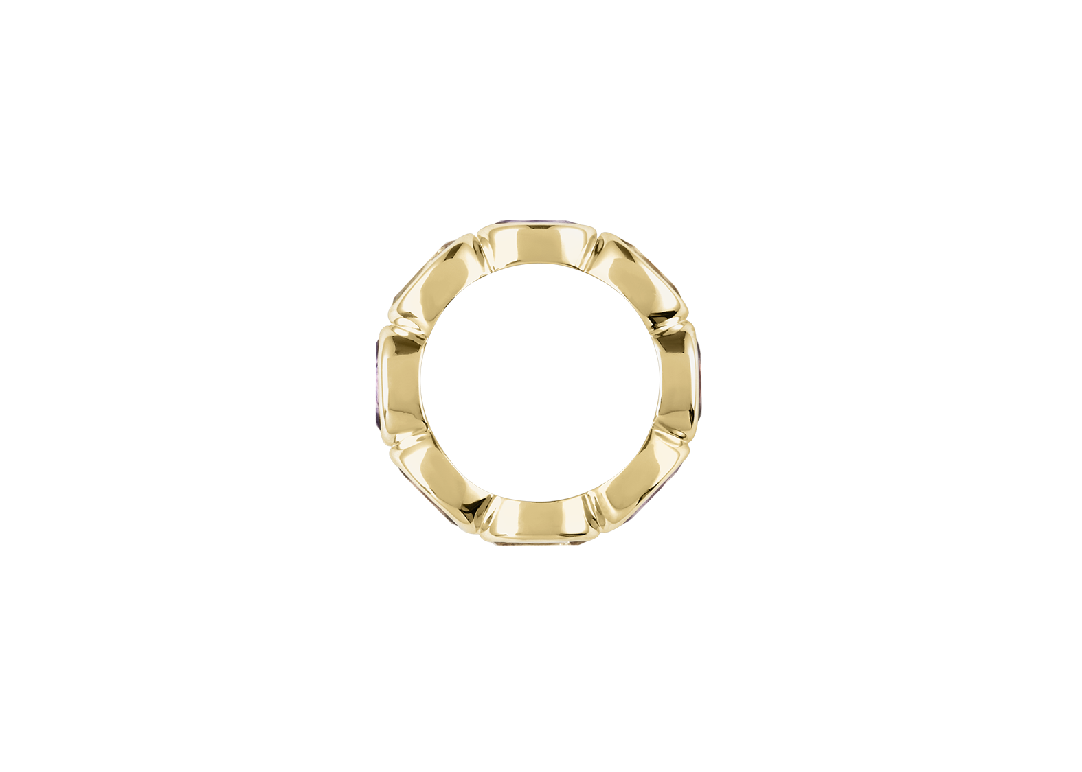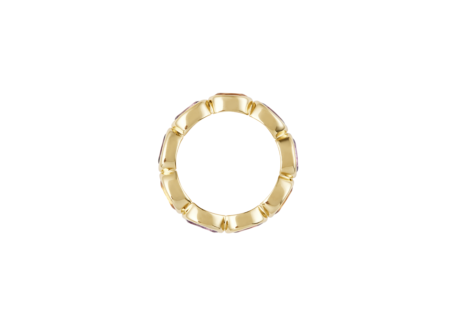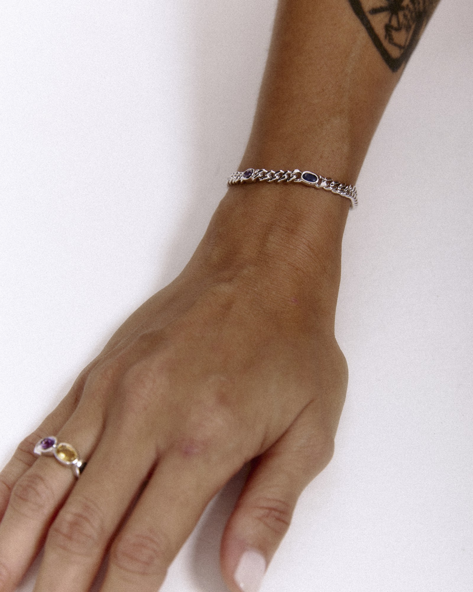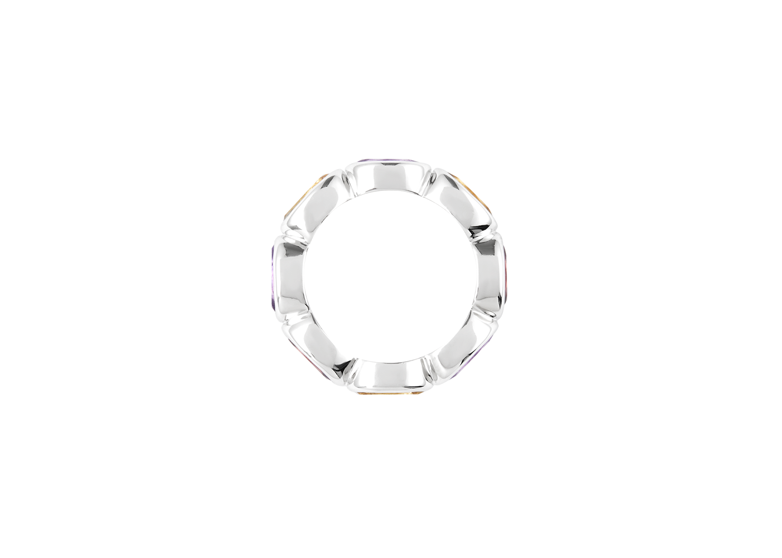 Our first signature band, Ying Band is a reiteration from our signature Ying Bracelet. The stones are set horizontally, mimicking the stones on the bracelet. Debuting with our “sunset” color way, the ring features a combination of red garnet, citrine and amethyst. Gemstones may vary in color.